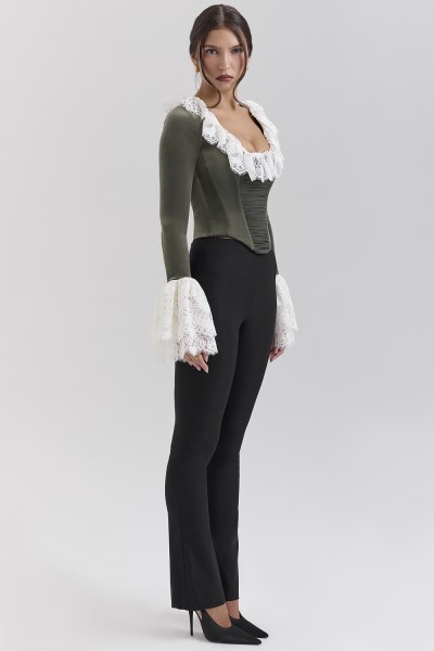 $58.50FREE DELIVERY ON YOUR ORDER Description Elevate your separates wardrobe with our 'Jacinda' Velvet and Lace Corset Top, a stunning blend of style and charm. Crafted from soft forest green stretch velvet, this top hugs your figure beautifully, creating a silhouette that’s both flattering and bold. The delicate ivory lace trim graces the…