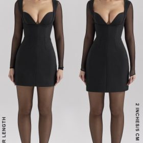 Get ready to turn heads in our 'Angelie' Mini Dress—a showstopper that combines elegance with a sultry edge and one that's a striking addition to the Holiday collection. Crafted from luxurious stretch crepe, the fitted bodice clings to your curves, radiating confidence and mystery. The plunge sweetheart neckline invites intrigue, while the long mesh sleeves add a hauntingly beautiful touch. A tailored waistline enhances your figure, flowing into a slight A-line skirt that gracefully sits at mid-thigh—perfect for casting spells at any evening affair. Style the 'Angelie' with edgy heels and bold accessories for a night of captivating encounters. In timeless black, this dress embodies the enchanting essence of the evening hours. And you can forget the fuss; this dress zips up the back for easy wear and feels just as sumptuous as it looks. For the perfect fit, our A-C cup girls will want to go for our ‘Regular Cup’ option, and our ‘Bigger Cup’ will best suit our D-E cup girls. Some say length doesn’t matter, but we beg to differ. That’s why this dress comes in two options – our ‘Regular’ and ‘Longer’ lengths (see below for length specifics.) WHERE TO WEAR: