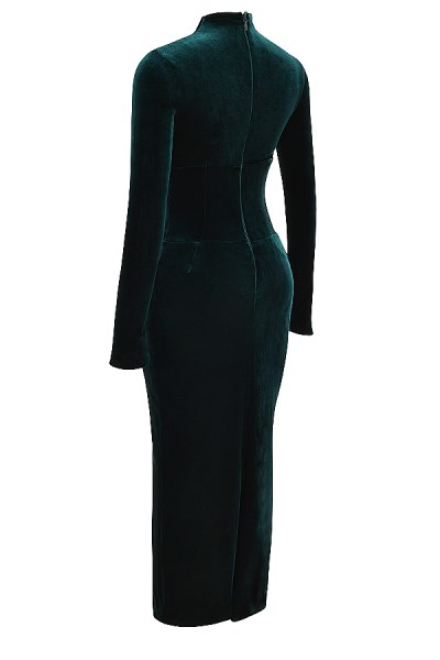 'Arabella' is one of our most glamorous dresses for the holiday season. Cut from sumptuously soft plush stretch velvet in a deep forest hue, 'Arabella' keeps it elegant yet sexy in a flattering curve creating silhouette. It features a shawl collar with an open plunge neckline that reveals a hint of cleavage and the boned bodice cinches the waist, complete with corset hooks for a snatching fit.