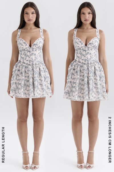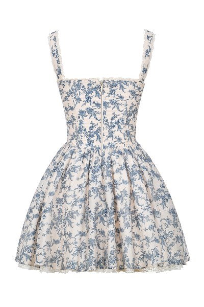 Our 'Brigitte' mini dress in a gorgeous English porcelain print is ultra feminine with a vintage feel. It has a corseted bodice for a cinched waist and a plunging shaped bust for gentle support. The delicate button detailing and flouncy mini skirt adds to the girlish feel, especially the soft tulle underskirt.
