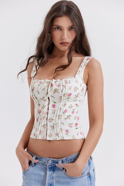 'Chicca' has us thinking of spring days. Cut from a soft linen, the floral print makes 'Chicca' the prettiest top for garden parties. It has a curved square neckline in a relaxed silhouette and features a shaped bust. We love how the threaded ties can be tied as loose as you like for the perfect fit and the hook and eye fasteners to the front can be worn as open as you dare. It's fully lined for comfort. Wear yours with a cute mini skirt or pair with our 'Yara' vintage fit jeans for pretty date nights. The 'Regular Cup' option suits cup size A-C whilst the 'Bigger Cup' option suits cup size D-E.