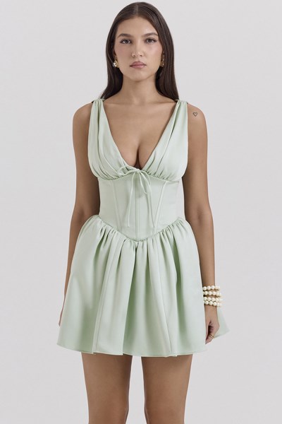 The night-out dress you’ve been daydreaming about. ‘Emmeliette’ is meticulously cut from a lavish pistachio satin, accentuated by a boned bodice and a plunging neckline that, as the cherry on top, we’ve finished with bow accents. Ruche detailing extends up its voluminous straps for a touch of texture, while the floaty skirt is delicately pleated; a romantic detail that flares it out ever so slightly, balancing the silhouette to perfection. And you can forget the fuss; this dress zips up the back for easy wear and feels just as sumptuous as it looks. For the perfect fit, our A-C cup girls will want to go for our ‘Regular Cup’ option, and our ‘Bigger Cup’ will best suit our D-E cup girls. Some say length doesn’t matter, but we beg to differ. That’s why this dress comes in two options – our ‘Regular’ and ‘Longer’ lengths (see below for length specifics.) WHERE TO WEAR: