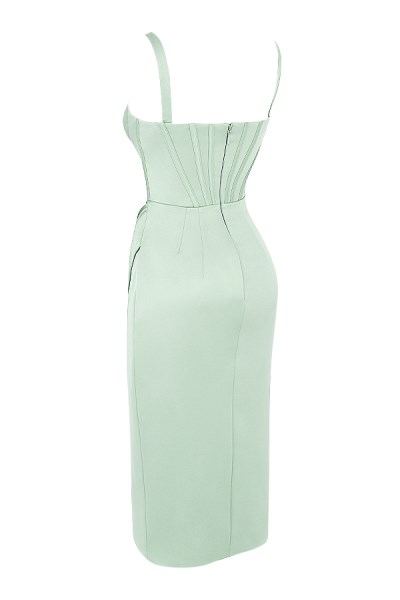 Our 'Faye' dress is equally feminine and flattering with a touch of elegance. Made from our ultra luxe duchess satin in a beautiful pistachio green, 'Faye' has a plunging neckline with pretty petal shape pleated cups, framed by slim straps. The bodice has our special corsetry boning to ensure the utmost support and gives the bust a volumising lift for the ultimate cleavage. The internal layer is lined in a stretch woven fabric for a non slip hold.