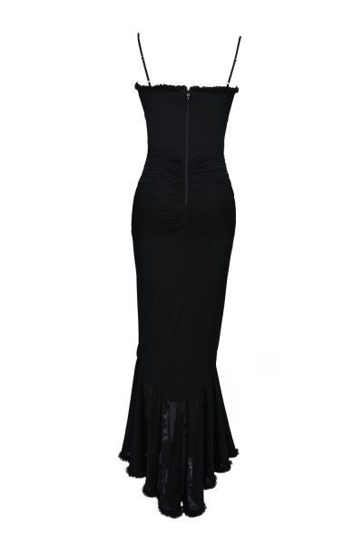 The ruffle-front drama of 'Gabbi' steals the show, but there’s so much more to this gown. Crafted from gathered stretch mesh in classic black, it’s secretly your best-kept secret for a sculpted silhouette, thanks to the power mesh lining that acts like built-in shapewear, hugging and smoothing in all the right places. The artful gathering at the hip flatters your figure, while the cascading waterfall ruffles bring major movement and flair, making every step a statement. The floaty hem sweeps into a trailing train that guarantees a jaw-dropping exit. With an easy back zip and an irresistibly bold vibe, 'Gabbi' is the ultimate partner for your tallest heels and a night to remember. The 'Gabbi' gown is perfect for black-tie events, weddings, or any glamorous evening. Pair it with sleek stiletto heels, a minimalist clutch, and statement earrings for effortless elegance. Style your hair in an updo or Hollywood waves to highlight the ruffles, and finish with a bold lip or smokey eye for maximum impact. WHERE TO WEAR: