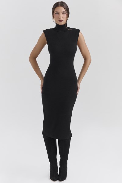 Gaia Black Cashmere Blend Turtle Neck Midi Dress