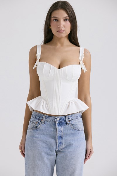 'Gigou' is that ultra feminine item you'll want to wear for every season. Perhaps one of the most romantic corsets we've ever made, 'Gigou' is made from a sustainable cotton and has softly shaped cups in a sweetheart neckline with pretty tied bows to the straps. The corseted bodice defines your waist.