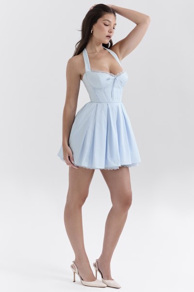 'Harriet' is a beautiful re-imagining of feminine babydoll silhouettes that we are obsessed with at HOCB. With halter ties, dainty bows and peek-a-boo lace trims at the bust, 'Harriet' is just delightful. The bodice is boned to cinch your waist and the cups are underwired. The tulle layers in Harriet's skirt create the voluminous shape that we continue to adore throughout our English Summer collection.