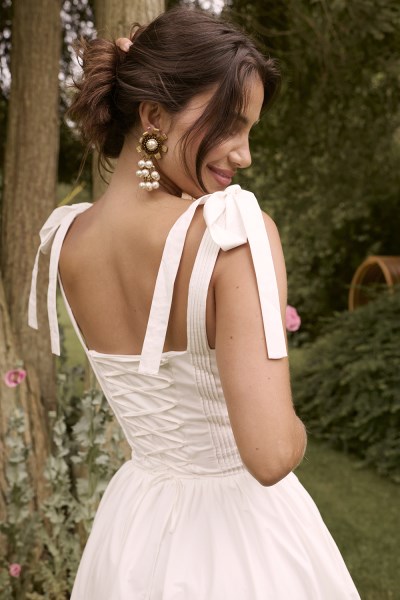 Our 'Hattie' midi sundress is gorgeously decorated with pin tuck detailing and pretty self tie straps for a romantic feel. Cut from a stretch cotton-rich fabric, 'Hattie' is elegant in a snowdrop hue. It has a fitted boned bodice to cinch your waist with a vintage style lace up back and floaty skirt.