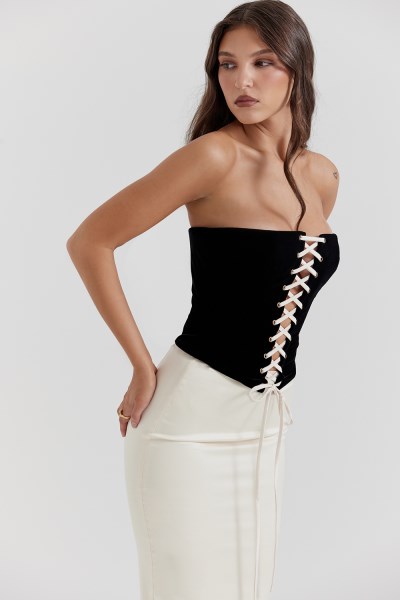 'Jaina' is beautifully made from plush stretch velvet, contrasted by lustrous stretch satin to create the most gorgeous dress for the party season. Cut to hug your figure, it has a stunning strapless neckline and a perfectly boned bodice to cinch the waist. The romantic lace up front self ties for the perfect fit but it zips to the side for easy on so once you’ve set the lace up to your preferred way, you won’t need to touch it again to take 'Jaina' on and off. Wear yours with tonal heels like 'Paris' in black. The 'Regular Cup' option suits cup size A-C whilst the 'Bigger Cup' option suits cup size D-E.