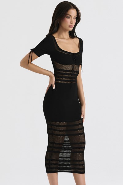 Cut from our luxury knit that's blended with plenty of stretch in timeless black, our 'Lilla' midi dress is ultra feminine. It's pencil silhouette features a low rounded neckline with a rouleau tie to the front and elongated short sleeves. The pretty openwork detail throughout the dress reveals a hint of skin for a dash of daring and it has a zip to the back for easy on. Wear yours with our 'Paris' heels in black suede.