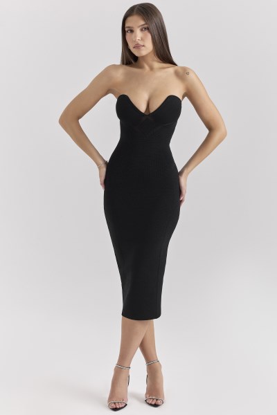 Meet 'Magdalena' by House of CB, the epitome of sultry sophistication. This strapless midi dress is crafted from luxurious black stretch viscose knit, designed to sculpt and flatter every curve. With a figure-hugging silhouette and a sleek, seamless finish, it’s made for turning heads. The daring neckline features an intricate cutout detail, adding a touch of drama to its minimalist design. Perfect for glamorous evenings or chic cocktail events, 'Magdalena' is your go-to for making a statement. Pair with bold accessories and let the dress do the rest. Made with recycled Viscose, a natural fibre made from regenerated cellulose. Known for its smooth and luxurious properties. WHERE TO WEAR: