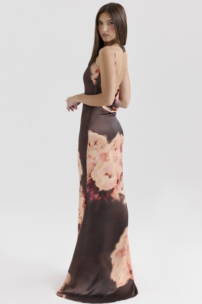 Mariamma Dark Brown Floral Printed Satin Maxi Dress