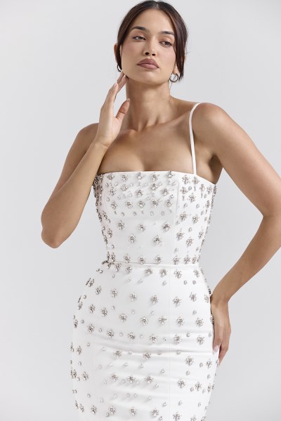 The attention to detail is exquisite, as 'Martine' is beautifully embellished with faux pearls and silver crystals throughout. It's underpinned with our incredible corsetry boning to create a secure, structured fit to cinch your waist and it's finished by slender straps.