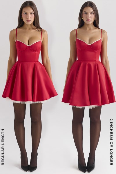 Meet ‘Minimoiselle' in our spectacular seasonal Holly Red. She's a sumptuous satin mini dress that’s ready to steal the spotlight and turn every occasion into a soirée. This stunning piece features a cupped corseted bodice, perfectly sculpted to hug your curves and enhance your silhouette, while the dainty lace trim adds a touch of romantic whimsy.