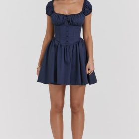Our French navy mini dress is so dreamy, it'll take you through to the end of Summer and beyond. Made from stretch cotton, it has a dainty sweetheart neckline framed by a gathered bust and pretty cap sleeves. The corset inspired bodice features a button front and cinches the waist gently before falling to a voluminous mini skirt.