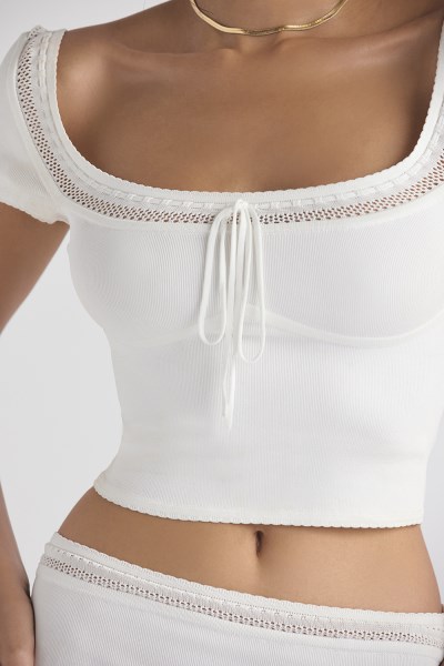 Our 'Nola' top will instantly dress up your favourite separates. Cut from our new luxury custom knit in delicate ivory, it has a pretty openwork detail to the low neckline with a rouleau tie to the front. The underbust seam lifts and shapes the bust. We love the scalloped trim to the cap sleeves and hem for a fine feminine finish. 'Nola' pulls on for easy wear and we love this matched with our 'Sarelle' mini skirt as our designers intended.