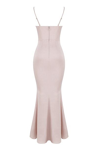 Romantic silhouettes and elegant glamour is what makes our new season collection feel so special and 'Olivette' ticks all the right boxes. Cut from our lustrous silk satin in a delicate crystal hue, 'Olivette' has a close fitting silhouette for an ultra feminine hourglass shape and the curved neckline and slim adjustable straps frame the décolletage so beautifully. The bodice has a pointed hem that dips below the waistline and features our incredible corsetry boning to cinch the waist. The skirt is relaxed below the knee with an elegant mermaid shape that sweeps the floor in a flattering maxi length. It is fully lined for comfort and has a zip to the back for easy on. Wear yours with our 'Lucent' mules for those glam functions and events.