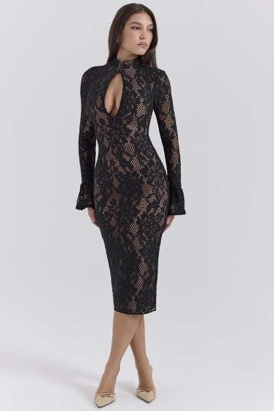 'Pierette' is a vision of elegance, effortlessly captivating everyone in the room. With her intricate lace overlay and flattering silhouette, you’ll see why she’s a must-have. Long sleeves grace the arms, beautifully hugging your figure while the bell cuffs offer a touch of romance. The striking keyhole neckline adds just the right amount of allure, drawing attention in all the best ways. As the lace cascades down, the body-hugging fit sculpts your curves, making this midi dress perfect for any occasion that calls for sophistication. She's lined in a neutral mesh for modesty. ‘Pierette’ is your ticket to unforgettable moments. WHERE TO WEAR:
