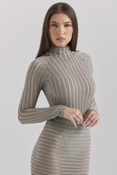 The 'Rowena' bodysuit in grey combines bold design with practical comfort. Featuring semi-sheer velour-effect stripes, this daring piece is cut with a turtleneck and long sleeves for a sleek silhouette. The pull-on style is equipped with gusset fastenings for convenience, while the front is lightly lined to ensure minimal show-through. Perfectly pairing with the 'Margo' skirt, the 'Rowena' bodysuit makes a striking addition to your wardrobe, ready to command attention wherever you go. WHERE TO WEAR: