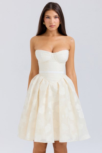 Lovingly made from a romantic floral jacquard, 'Saige' is our vintage cream mini dress. Blooming with pretty flowers, it has a strapless neckline and the sweetheart shaped cups are underwired for support. The vintage style bodice is fully corseted and we love the dainty ribbon to the waist that ties beautifully at the back. Perfectly pleated from the waist, the skirt is full and floaty. It zips to the back for easy on. Style yours with neutral heels. The 'Regular Cup' option suits cup size A-C whilst the 'Bigger Cup' option suits cup size D-E. Taller girls, we heard you and this is available in two lengths, our regular mini length and 2 inches / 5cm longer. Regular: Approx 80cm and Longer: Approx 85cm. WHERE TO WEAR: