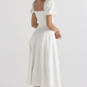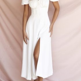 'Tallulah's crisp fresh look has us dreaming of those garden parties and summer trips. It's cut from our lightweight linen mix for a fresh feel in a delicate white hue. The bodice has corsetry boning to the front, back and sides for that perfect cinched hourglass shape and the lightly shaped cups are lined for a comfortable fit. The pretty puff sleeves add to the fun and floaty vibe of 'Tallulah' and we love the way that the side thigh split shows just a flash of thigh as you walk. 'Tallulah' is just perfect for girls who wanna be girls who wanna be sexy.
