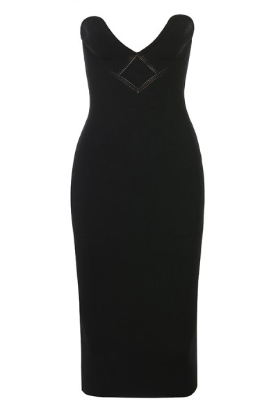 Description Meet 'Magdalena' by House of CB, the epitome of sultry sophistication. This strapless midi dress is crafted from luxurious black stretch viscose knit, designed to sculpt and flatter every curve. With a figure-hugging silhouette and a sleek, seamless finish, it’s made for turning heads. The daring neckline features an…