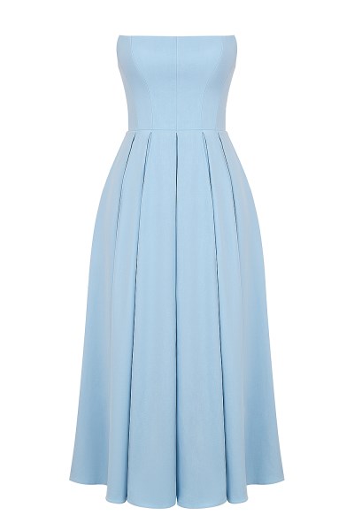 $89.70FREE DELIVERY ON YOUR ORDER Description 'Audrey' is our beautifully constructed midi sundress that's cut from soft peached Rayon twill in a gorgeous Tuscan blue. It has a strapless, corseted bodice to cinch and shape your waist and a perfectly pleated midi skirt. The tulle underskirt creates pretty volume and…