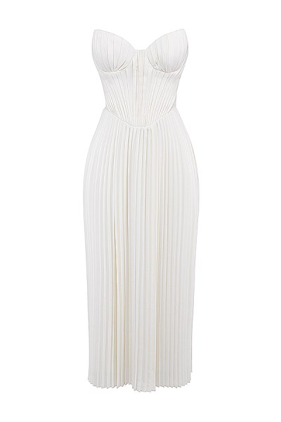 $76.50FREE DELIVERY ON YOUR ORDER Description Our 'Alora' midi dress is perfect for any glamorous event. Cut from our lustrous duchess satin, it has a pleated strapless bodice that's fitted with internal boning to cinch the waist and a close fitting long pleated midi skirt for a striking silhouette. We…