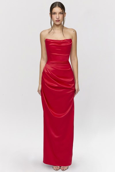 It's all about feminine tones and languid, sexy drapes with 'Adrienne'. It's cut from our ultimate high quality weighty and lustrous duchess satin. It drapes sexily across the bust and cinches the waist. The internal structure is specially boned for ultimate fit and support and the corsetry continues through the back and the sides. The bodice is cut in a balconette shape and sports our extra special side boob boning to give you ultimate uplift and cleavage and it's lined with a textured crepe to provide a non slip effect. The long skirt drapes gracefully over the hips with pretty gathers over the side and the hem dramatically grazes the floor. The skirt is fully lined in tonal stretch fabric for a super smooth and seam free finish. This is suitable for all bust types as it has no cups but the superb corsetry provides ultimate support and uplift. A bra is not necessary but it can be worn if desired. The 'Regular Cup' option suits cup size A-C whilst the 'Bigger Cup' option suits cup size D-E.