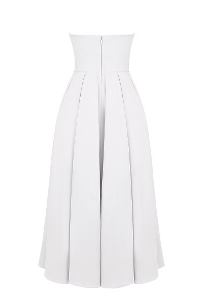 'Audrey' is our beautifully constructed midi sundress that's cut from soft peached Rayon twill in a delicate white hue. It has a strapless, corseted bodice to cinch and shape your waist and a perfectly pleated midi skirt. The tulle underskirt creates pretty volume and 'Audrey' has us dreaming of warmer climates and champagne garden parties. It zips to the back for easy on. Wear yours with our 'Lola' sunkissed heels. Made from 65% Lyocell which is a natural fibre known for its soft and breathable properties. WHERE TO WEAR: