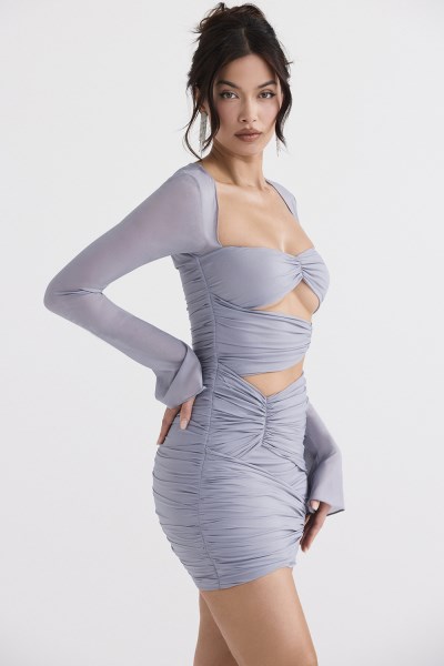 Featuring our signature draping, 'Camille' is the dress you'll want to wear all season long. Cut from our lightweight stretch georgette fabric that is blended with Mulberry silk in a dove grey hue, 'Camille' features a corseted bandeau to the bust and gathered panels for a figure flattering fit. 'Camille' is fully lined for a smooth comfortable fit. Wear yours with our 'Tao' sandals in black.