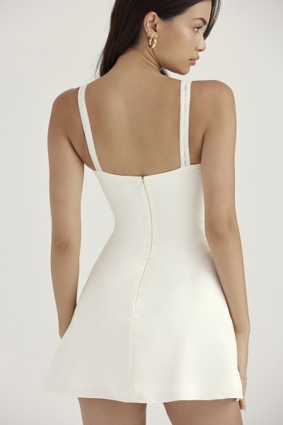 Our 'Cassandra' mini dress showcases our love for all things feminine. Cut from our glossy and luzurious duchess satin, 'Cassandra' features a pretty sweetheart neckline and underwired cups for a bust flattering fit. It's detailed with delicate lace and backed in our special power mesh for coverage and support. The lace straps frame the decolletage so beautifully and the skirt falls to a fluted hem. It has a zip to the back for easy on and is fully lined for comfort. Wear yours with our 'Lola' high heels in white. The 'Regular Cup' option suits cup size A-C whilst the 'Bigger Cup' option suits cup size D-E.