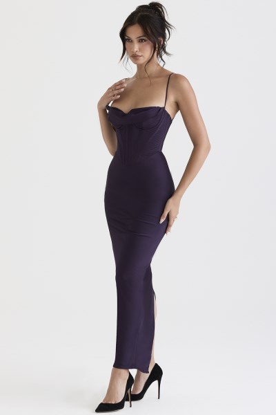 'Charmaine' is just the epitome of elegance and class, made from our lustrous silk satin in a deep nightshade hue and cut on the bias to gently skim your figure. It has a beautifully draped cowl neckline and the bodice features our incredible corsetry boning to cinch the figure in. The pretty half cups are softly lined and underwired for full support and uplift, framed by delicate shoulder straps that adjust for the perfect fit. The skirt falls to an elegant maxi hem and 'Charmaine' is fully lined for comfort with a zip to the back for easy on. Wear yours with dainty sandals like our 'Lucent' mules. The 'Regular Cup' option suits cup size A-C whilst the 'Bigger Cup' option suits cup size D-E.