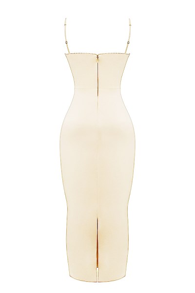 Simplicity at its most elegant in our 'Costanza' dress, cut from luxurious sheen satin in a gorgeous vintage cream. The bodice features our signature corsetry boning to the sides for a structured fit and the sleek silhouette will hug your curves to perfection. We love the scalloped trim and the barely there straps adjust for the perfect fit. The skirt falls to a flattering maxi length with a split to the hem for easy movement and it's fully lined for a smooth finish. 'Costanza' zips up the back for easy on and looks ultra chic styled with neutral sandals like our 'Ghost' clear strap sandals.