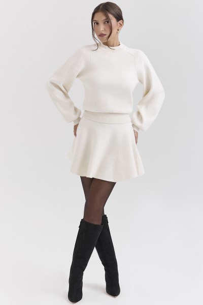 Elevate your knitwear collection with the 'Cressida' Ultra Luxe Sweater, crafted from a heavyweight wool-cashmere blend that offers unparalleled softness and warmth. This sweater features a classic ribbed crew neck and chic balloon-shaped sleeves, adding a touch of playful elegance to your look. The dropped shoulders create a relaxed fit, while the deep ribbed waistband detailing flatters your figure, ensuring you look effortlessly stylish. Perfectly paired with the coordinating 'Rosina' Mini Skirt, the' Cressida' sweater is designed for the modern woman who values comfort without compromising on style. Team yours with the 'Rosina' mini skirt and high boots with tights or wear this ultra cosy sweater with your favourite denim and a beanie. WHERE TO WEAR: