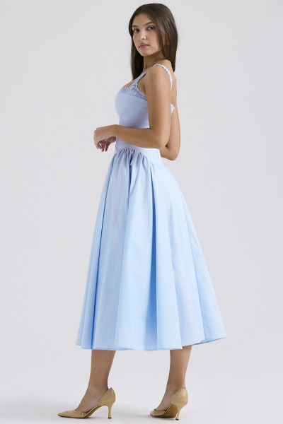 'Dorothy' is luxuriously made from a sustainable stretch cotton in a soft italian azure. Our love for romantic silhouettes this season makes 'Dorothy' the perfect addition to our Capri collection. The sweetly gathered neckline extends through the straps and we love how they are wide enough to hide your bra. The fitted bodice secures the fit and the pretty, voluminous skirt will swish beautifully with every step. 'Dorothy' falls to a classic midi length that works so well with dainty mules like 'Andromeda' in off white. Pima Cotton acquires sustainability due to its long life span and is generally hand picked which helps to retain the goodness of the cotton fibre, producing less waste therefore reducing environmental impact. Unlike regular cotton, it's known for its luxurious quality and extra long fibres, making it stronger and a more durable type of cotton. It's naturally breathable and perfect for sensitive skin types as it is hypoallergenic. WHERE TO WEAR: