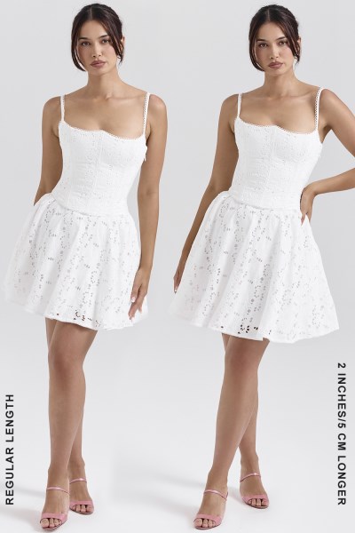 Our 'Elara' mini dress is rich in intricate details. It features beautifully heavyweight Broderie Anglais, made from 100% cotton in a dainty floral pattern. The corseted bodice cinches the waist, topped with a pretty peaked neckline and delicate adjustable straps. It turns to reveal a vintage style lace up back. 'Elara' really is a Summer dream.