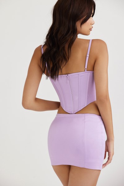 The minimalist feel of our 'Elodie' mini skirt means it works so well for most occasions and the pretty orchid hue is a season favourite. Cut from our lustrous duchess satin, it has a low-rise waist and skims over the hips for a figure flattering silhouette and we love the contouring seams to accentuate the shape. It is fully lined for a smooth finish and has a zip to the left side for easy on. Wear yours with our 'Tamsin' corset for a matching fit.