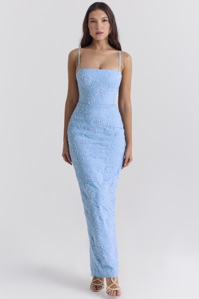 Our 'Eva' dress is a dream option for your special occasions. Made from a delicate embroidered floral lace in a beautiful Tuscan blue that's backed with a naturally stretchy cotton-rich fabric, the bodice features our signature corsetry boning to the sides for a structured fit and the elegant silhouette will hug your curves to perfection. We love the scalloped trim and the barely there straps adjust for the perfect fit. The skirt falls to a flattering maxi length with a split to the hem for easy movement and zips to the back for easy on. 'Eva' looks her most glamorous styled with vertiginous heels like our 'Lola' in sunkissed.