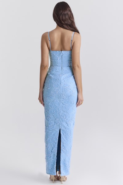 Our 'Eva' dress is a dream option for your special occasions. Made from a delicate embroidered floral lace in a beautiful Tuscan blue that's backed with a naturally stretchy cotton-rich fabric, the bodice features our signature corsetry boning to the sides for a structured fit and the elegant silhouette will hug your curves to perfection. We love the scalloped trim and the barely there straps adjust for the perfect fit. The skirt falls to a flattering maxi length with a split to the hem for easy movement and zips to the back for easy on. 'Eva' looks her most glamorous styled with vertiginous heels like our 'Lola' in sunkissed.