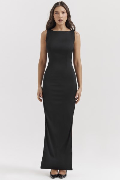 Our 'Filomena' dress has a sleek silhouette that exudes feminine glamour. It has a sleeveless cut that's made from luxurious matte satin jersey with a hint of stretch. 'Filomena' has a glossy feel and we adore how the smooth figure hugging fit accentuates your curves. The sexy side split reveals a flash of leg and looks the most elegant styled with tonal heels like 'Paris' in black.