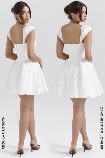 It zips to the back for easy on and looks ultra feminine styled with tonal mules like 'Andromeda' in off white. The 'Regular Cup' option suits cup size A-C whilst the 'Bigger Cup' option suits cup size D-E. Taller girls, we heard you and this is available in two lengths, our regular mini length and 2 inches / 5cm longer. Regular: Approx 81cm and Longer: Approx 86cm.