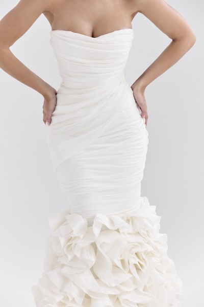 'Gabrielle' is all about celebrating the beauty of the moment, capturing your special day with elegance. This strapless gown is beautifully gathered from a delicate white organza that hugs and flatters your curves so effortlessly and the bodice is constructed from our amazing corsetry boning to cinch and shape your waist.