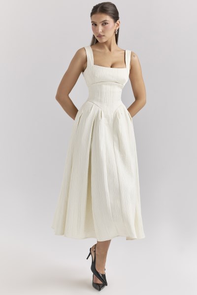 Isabeau Ivory Textured Satin Corset Midi Dress