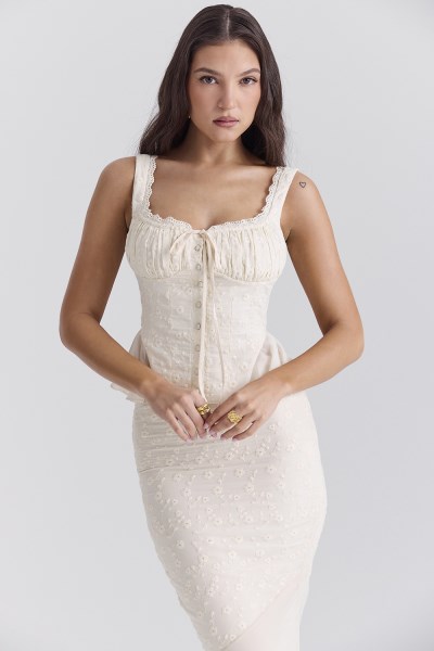 No bra required due to the gathered bust. Made from cotton-rich broderie anglais 92% cottton 8% poly. Fully lined. Stretch Factor: Little Stretch Designed For House Of CB