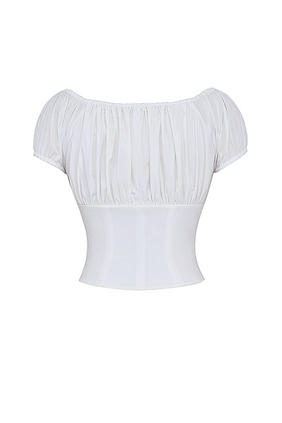 Made from stretch white cotton, 'Kitty' is perfect for spring and summertime events. It has a rounded neckline with pretty gathering and the bodice is fully corseted to cinch the waist, centred with delicate buttons to personalise the fit. Notice the pretty rouleau ties too at the hem. 'Kitty' will pair so nicely with a vintage skirt like 'Cora'. The 'Regular Cup' option suits cup size A-C whilst the 'Bigger Cup' option suits cup size D-E.