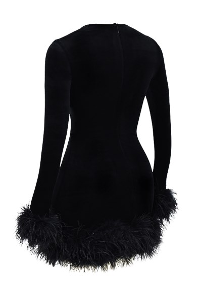 Dress Length: Approx 88cmMaterials: Heavy Stretch Velvet, Feather Trims, Stretch SatinGentle Dry Clean Only Model is 5 ft 8 and wears size XS Colour may vary due to lighting on images. The product images (without model) are closest to the true colour of the product.