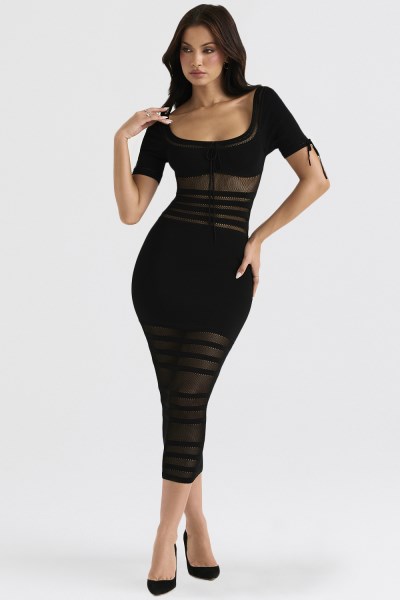 Cut from our luxury knit that's blended with plenty of stretch in timeless black, our 'Lilla' midi dress is ultra feminine. It's pencil silhouette features a low rounded neckline with a rouleau tie to the front and elongated short sleeves. The pretty openwork detail throughout the dress reveals a hint of skin for a dash of daring and it has a zip to the back for easy on. Wear yours with our 'Paris' heels in black suede.