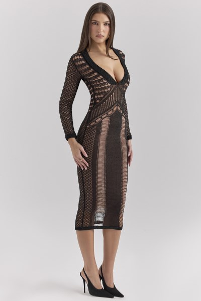 The 'Loula' dress is a masterclass in understated glamour. Crafted from a luxurious metallic yarn, this midi-length piece effortlessly combines stretch and structure for a flattering, body-hugging fit. The dramatic plunge neckline adds a sultry touch, balanced by long sleeves that make it perfect for cooler weather. Intricate knit detailing creates a stunning interplay of texture and shimmer, while the elegant silhouette transitions seamlessly from day to night. Whether paired with heels for an evening event or styled more casually, 'Loula' is your go-to for weather-appropriate sophistication with a touch of sparkle. Made with Viscose, a natural fibre made from regenerated cellulose. Known for its smooth and luxurious properties. TEAM YOURS WITH: