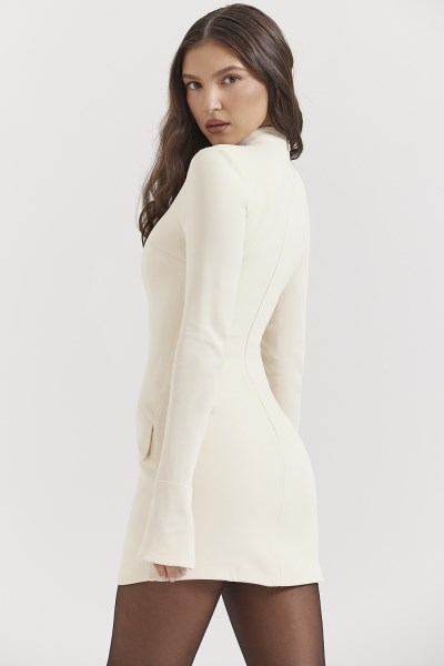 'Mahalia' is a beautifully constructed, form fitting stretch dress that really flatters the body. The sleek silhouette is set off by decorative flap pockets and the fluted cuffs add a little drama.